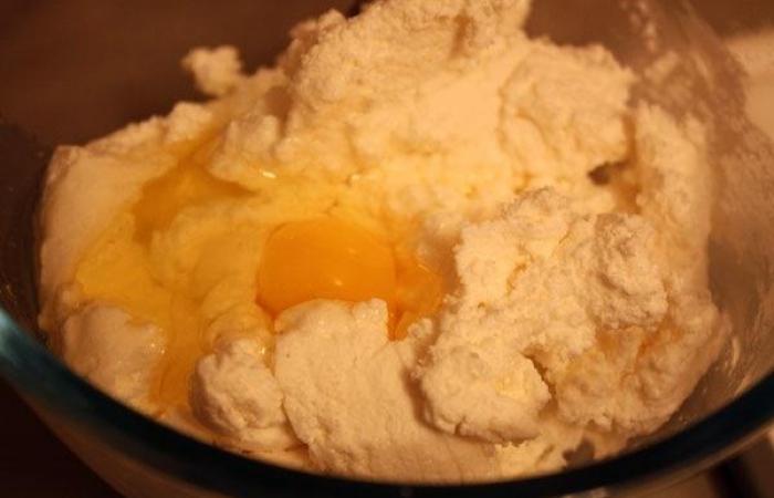 2Готовим начинку. Творог растираем с сахаром и яйцом.