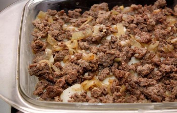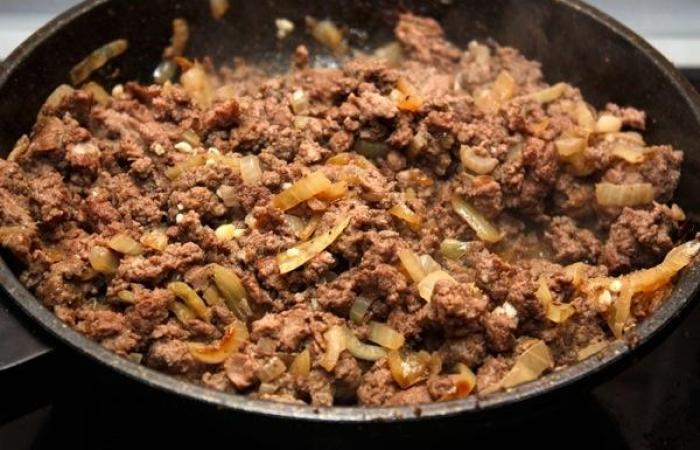 3Затем выкладываем фарш и распределяем его равномерно по всей поверхности.