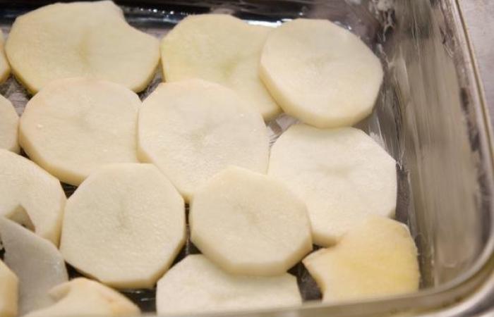 2Картофель режем кружочками и выкладываем половину в форму для запекания. Солим, перчим и поливаем половиной сливок.