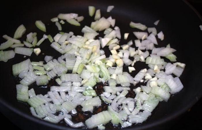 1Спагетти отвариваем в подсоленной воде, согласно инструкции, указанной на упаковке . Тем временем лук с чесноком измельчаем и обжариваем на оливковом масле в течение 3-4 минут, периодически помешивая.