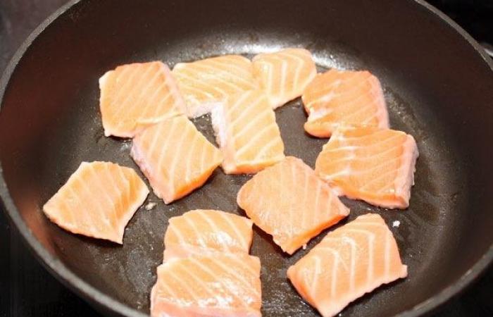 3Тем временем рыбу режем порционными кусочками и обжариваем на сухой сковороде в течение 2 минут с каждой стороны.