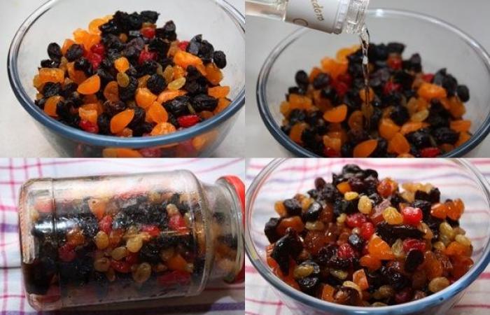 1Предварительно сухофрукты заливаем ромом, перемешиваем и выкладываем в банку. Закрываем плотно крышкой и даем постоять 3-4 дня, периодически встряхивая банку.