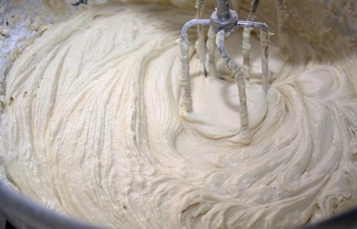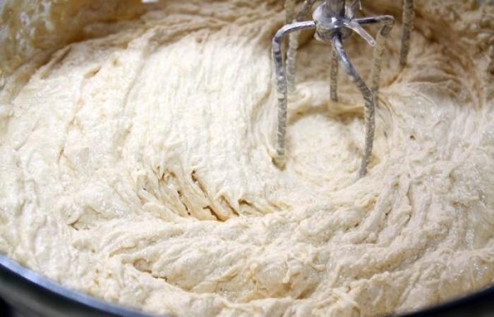 4Затем добавляем разрыхлитель теста и 250 г муки. Продолжаем взбивать.