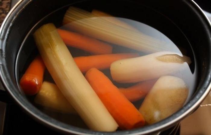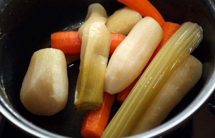 1Очищаем овощи: морковь, лук-порей, сельдерей, пастернак и корень петрушки. Добавляем лавровый лист и гвоздику. Заливаем все водой и доводим до кипения. Варим на медленном огне в течение 1,5 часа.