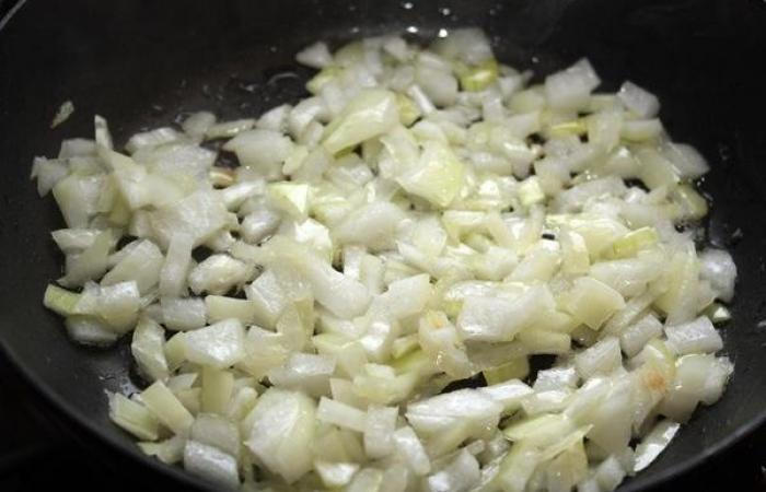 2Тем временем лук нарезаем мелкими кубиками и обжариваем на масле до прозрачности в течение 5 минут.