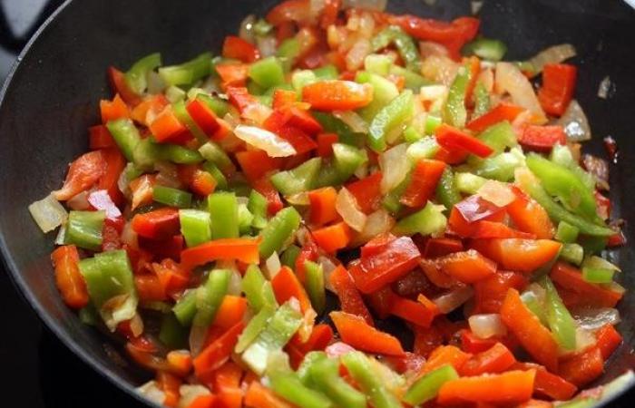 3Перцы очищаем от семян и нарезаем мелкими кубиками. Добавляем к луку и продолжаем обжаривать еще в течение нескольких минут.