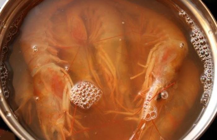 6Креветки достаем из бульона, а сам бульон процеживаем. Креветки очищаем от панциря.