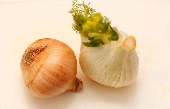 2Лук с фенхелем также очищаем и нарезаем четвертинками.