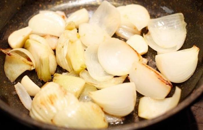 4Разогреваем сковороду, наливаем масло и выкладываем фенхель с луком и зубчиками чеснока. Обжариваем на медленном огне в течение нескольких минут.