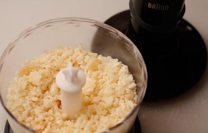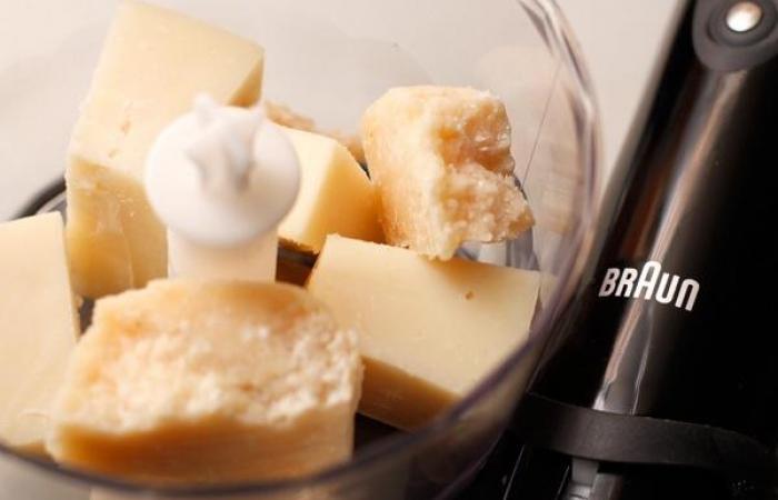 4Измельчаем сыр до состояния крошки. Вообще, пармезан можно натереть и на терке, но это будет достаточно тяжело.