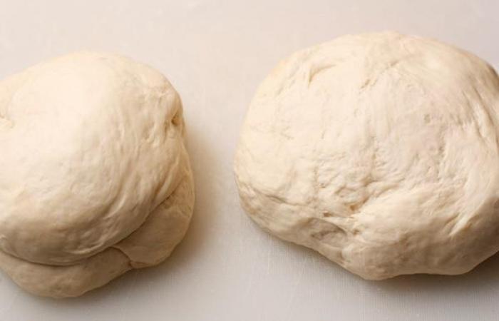 5Подошедшее тесто делим на 2 части и скатываем каждую в шар.