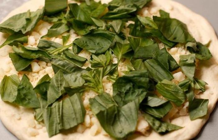 6Раскатываем одну часть теста и посыпаем сыром, а затем выкладываем рубленый крупными кусками базилик. Выкладываем на противень, застеленный пергаментом или посыпанный мукой.