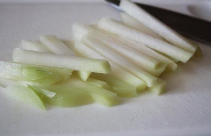 1Кольраби очищаем от кожуры и нарезаем соломкой. Затем заливаем 400 мл воды и варим в течение 5 минут. Бульон не выливаем.