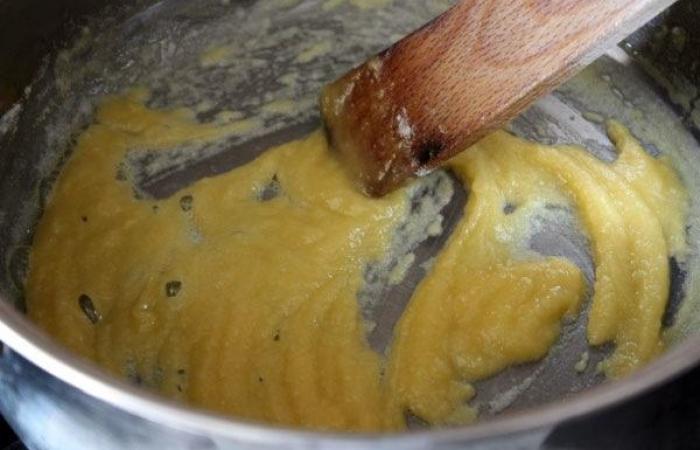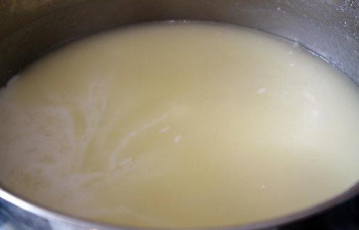 5Постепенно вливаем молоко и капустный бульон, постоянно помешивая смесь.