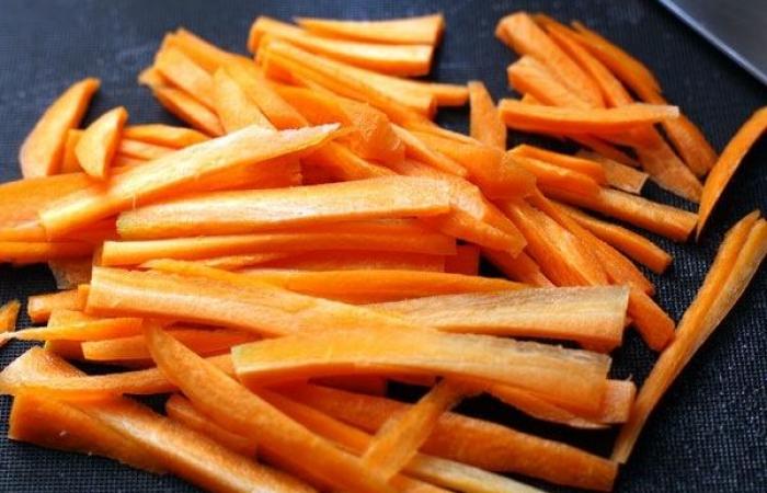 4Морковь нарезаем тонкой соломкой и добавляем в суп.