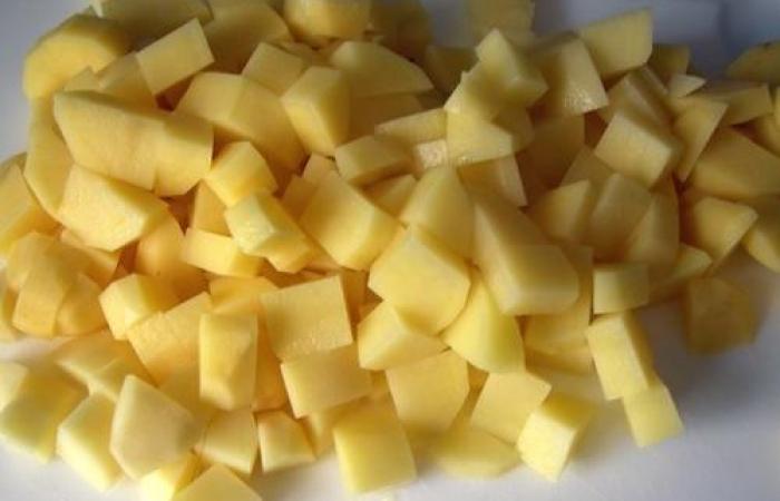 2Картофель нарезаем мелкими кубиками и выкладываем в кастрюлю.