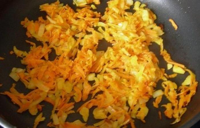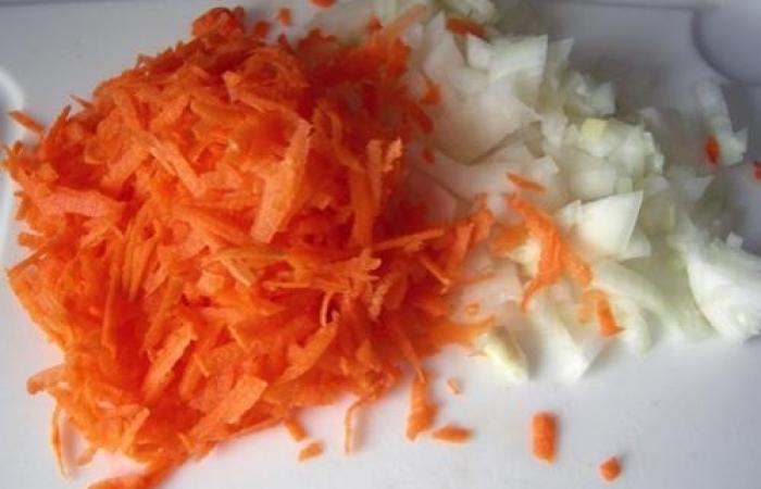 4Морковь трем на крупной терке. Лук режем мелкими кубиками.