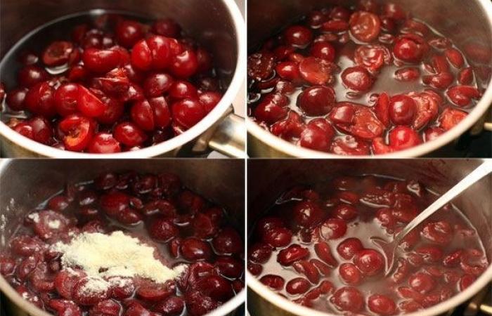 4Затем выкладываем вишни и варим в течение 5 минут. Добавляем кукурузную муку, перемешиваем и варим до загустения в течение нескольких минут.