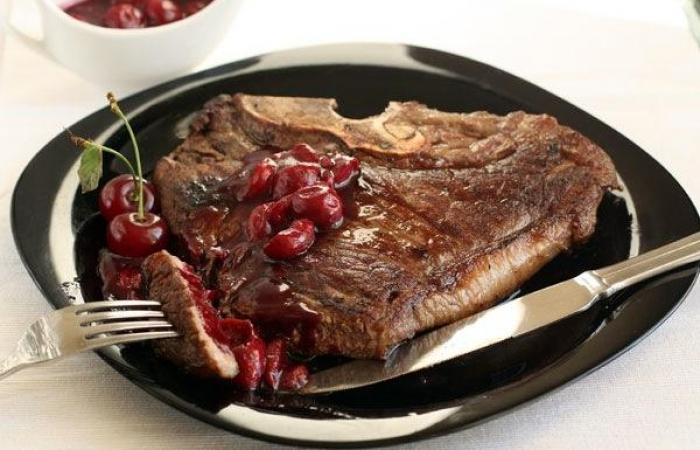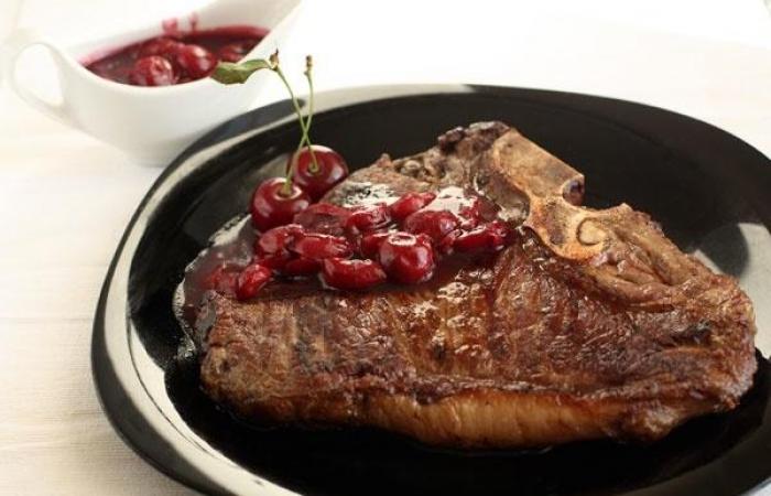 Необычный стейк ти-бон получил свое название за счет косточки внутри мяса. Чудесный вишневый соус для данного стейка получается кисло-сладким с приятным ванильным ароматом. Вообще, соус можно готовить как в сезон вишни, так и зимой, используя замороженные ягоды.