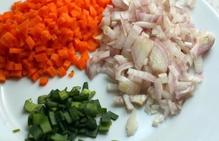 3Лук-порей, лук шалот и морковь режем мелкими кубиками.