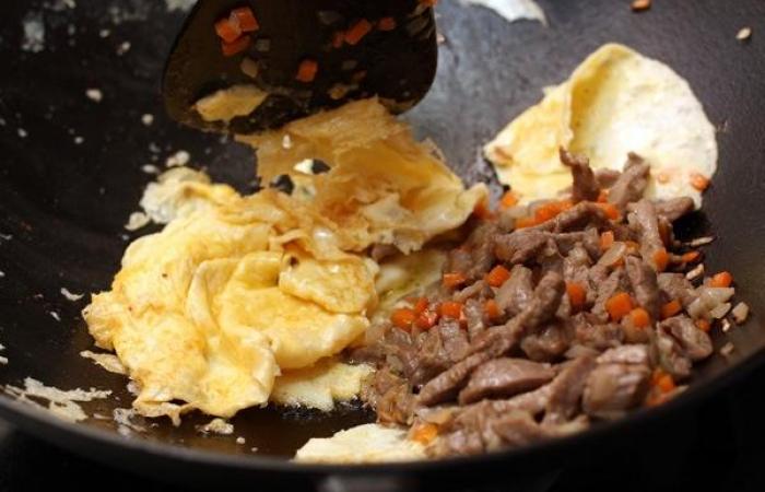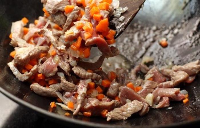 5Мясо режем небольшими тонкими полосками и добавляем к луку. Также добавляем морковь и лук шалот. Обжариваем ингредиенты в течение 5-7 минут, периодически помешивая.