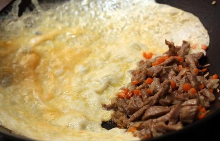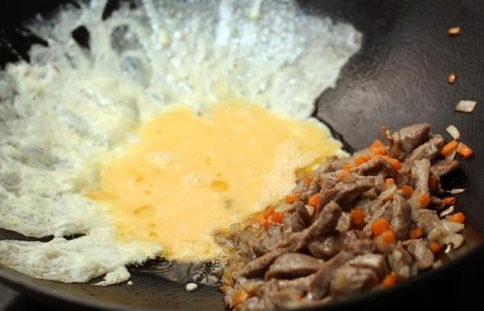 6Мясо с овощами сдвигаем на край, а на свободное пространство разбиваем яйцо.