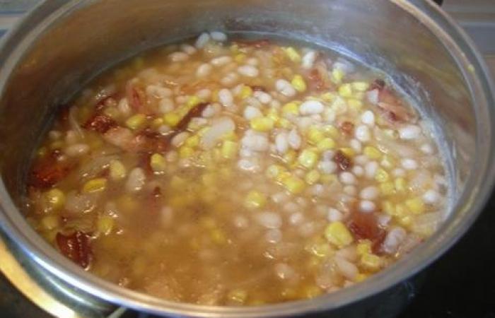 5Затем добавляем кукурузу, доводим до кипения и варим еще 5 минут.