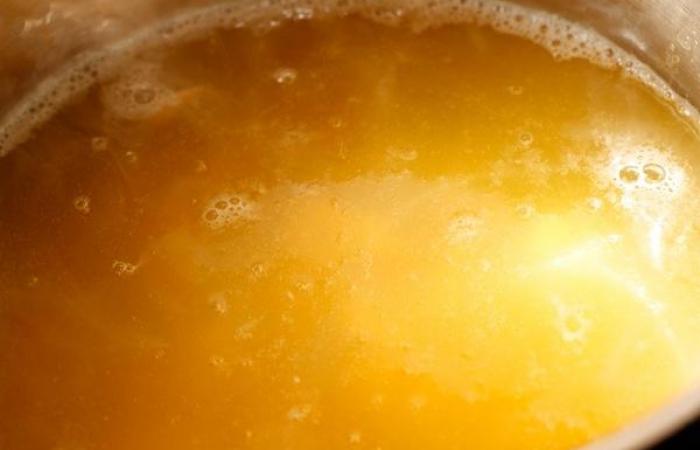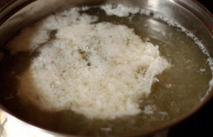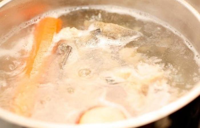 3По истечению времени удаляем части рыбы и овощи. Добавляем взбитый белок и доводим до кипения. Процеживаем