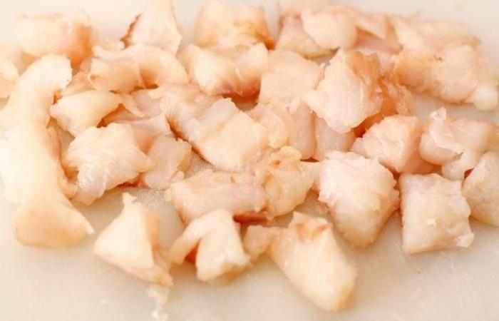 4Рыбное филе нарезаем небольшими кубиками.