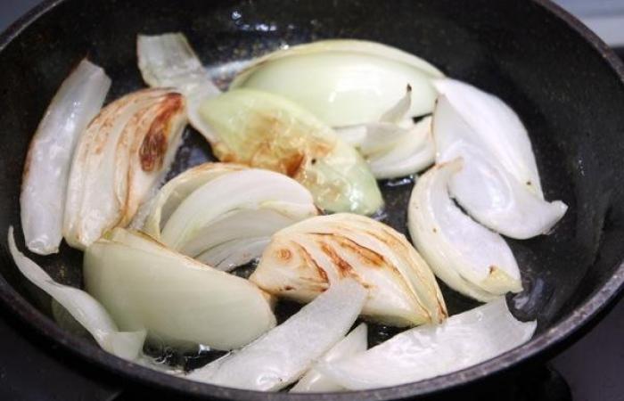 2Лук нарезаем крупными произвольными кусочками и обжариваем до мягкости в течение 4-5 минут.