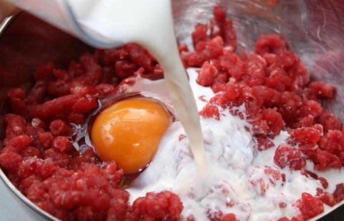 4Тем временем готовим тефтели. В говяжий фарш добавляем молоко с яйцом.