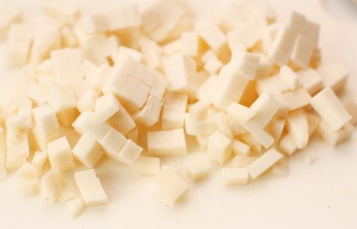 4Тем временем сыр нарезаем мелкими кубиками.