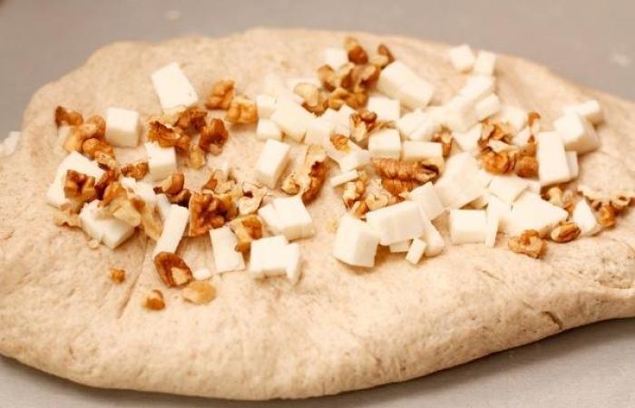 6Раскатываем тесто в лепешку и выкладываем треть сыра и орехов и вмешиваем их в тесто. Данную процедуру повторяем дважды.