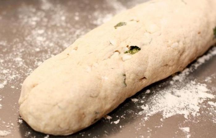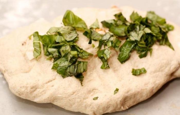 7Затем рубим базилик и треть его закатываем в тесто. Делаем процедуру дважды.