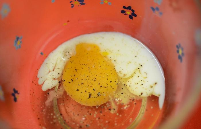 1В глубокую миску разбиваем яйцо и добавляем молоко. Солим, перчим по вкусу.