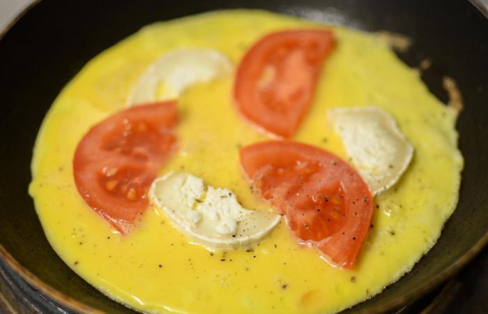 5Затем добавляем ломтики помидора и козьего сыра. Солим, перчим по вкусу и готовим около 3 минут.