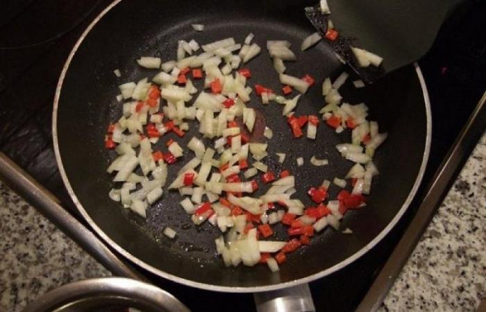 1Растапливаем сливочное масло в сотейнике или глубокой сковороде и обжариваем порезанные кубиками лук и перец чили.