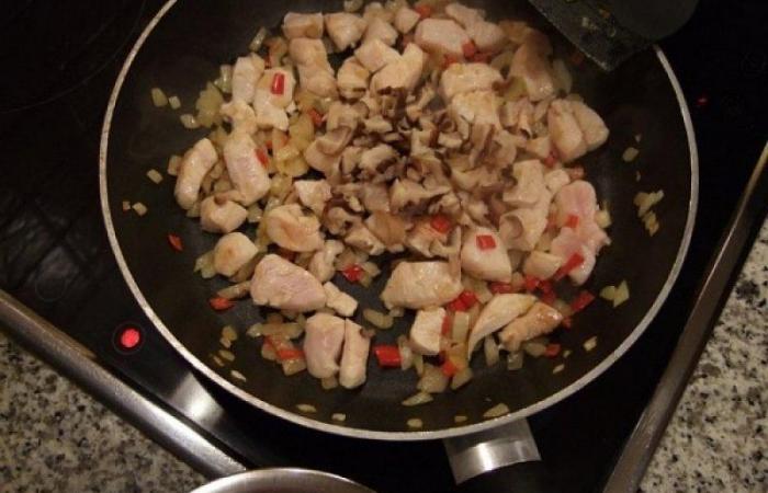 2Добавляем порезанную кубиками куриную грудку и продолжаем обжаривать.