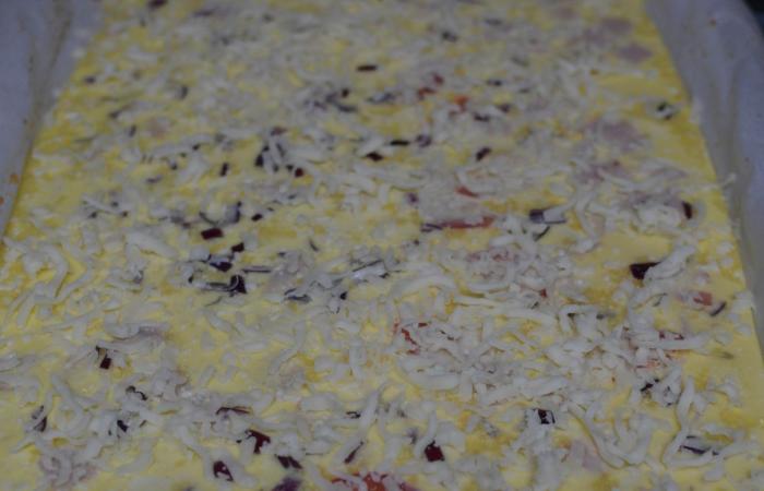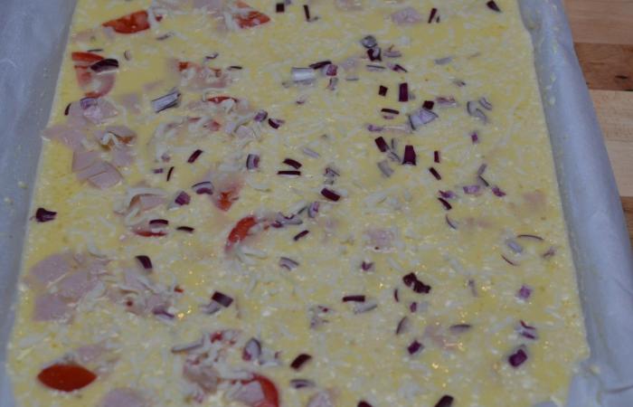 3Мелко нарезанные овощи с беконом выкладываем на противень, застеленный бумагой для выпечки. Заливаем начинку молочно-яичную смесь. Отправляем в духовку на 15 минут, предварительно разогретую до 180 градусов.