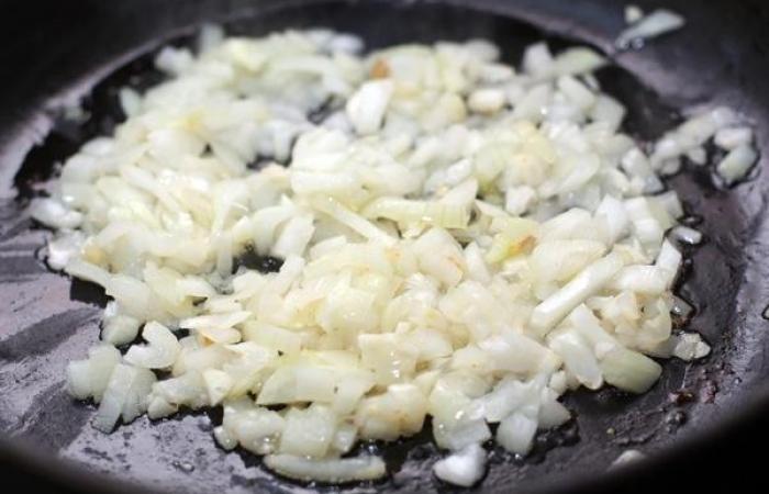 1Лук нарезаем мелкими кубиками и обжариваем на масле в течение 5 минут до прозрачности, периодически помешивая.