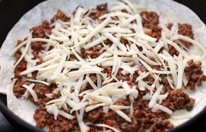 6Выкладываем лепешку на сухую разогретую сковороду и посыпаем слегка сыром, а затем кладем часть мясной начинки и снова посыпаем тертым сыром. Жарим в течение 2 минут.