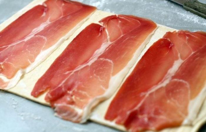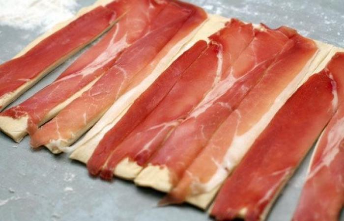 2Тесто с ветчиной разрезаем поперек полосками шириной примерно 2 см.