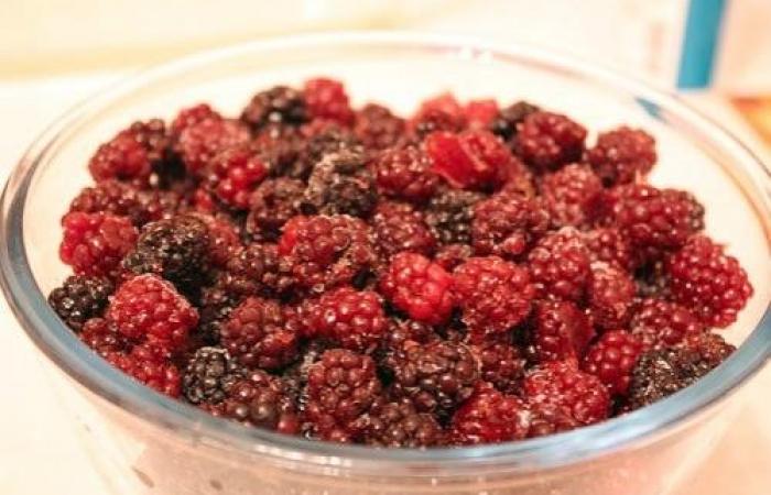 6Тем временем готовим начинку. Ежевику смешиваем с крахмалом и 50 г сахарной пудры.