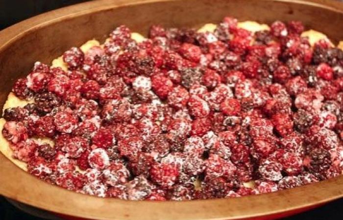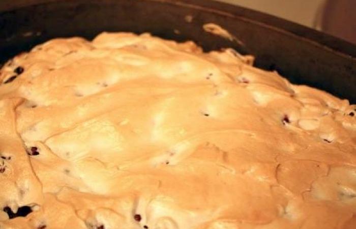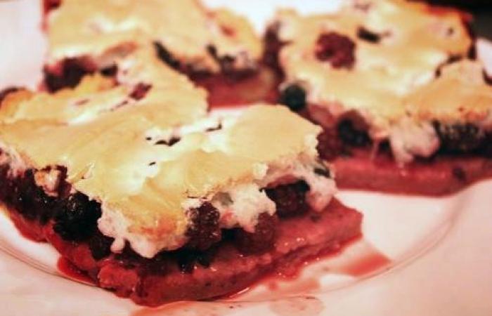 8Белки взбиваем с оставшейся сахарной пудрой до твердых пиков. Выкладываем белковую смесь на ягоды и отправляем в духовку на 35-40 минут, предварительно разогретую до 190 градусов.