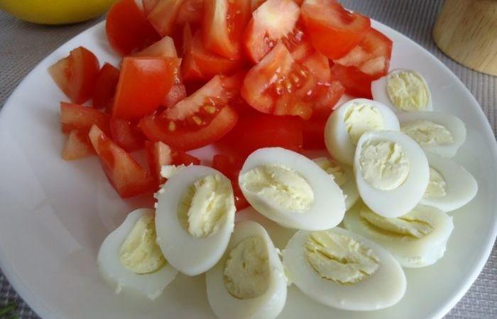 3Яйца разрезаем пополам, а помидоры нарезаем небольшими кусочками.