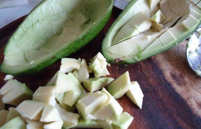 4Авокадо разрезаем пополам, достаем косточку и аккуратно достаем мякоть. Мякоть режем кубиками.