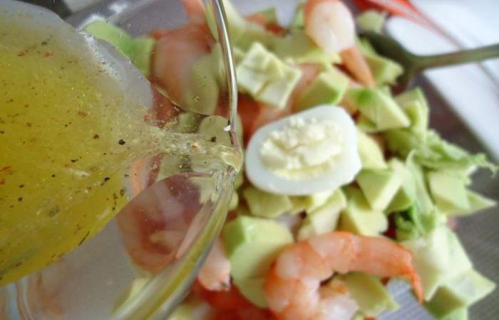 5В салатницу выкладываем все ингредиенты: креветки, яйца и помидоры. Поливаем заправкой.
