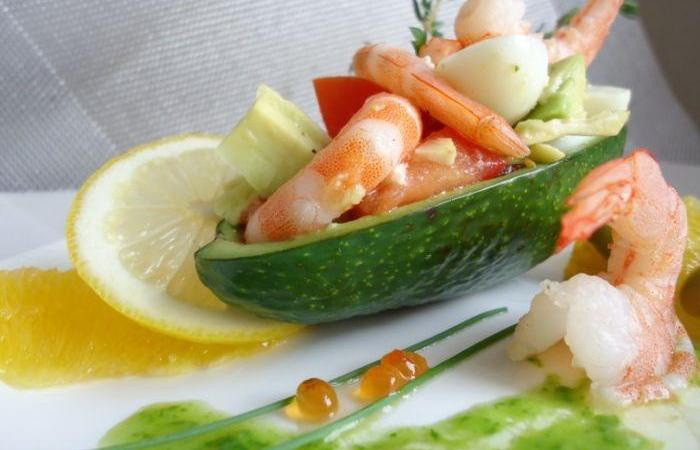 Креветки и авокадо - прекрасное сочетание в салате. Особенную изюминку салату придает заправка из апельсинового сока, а также оригинальная подача прямо в авокадо.