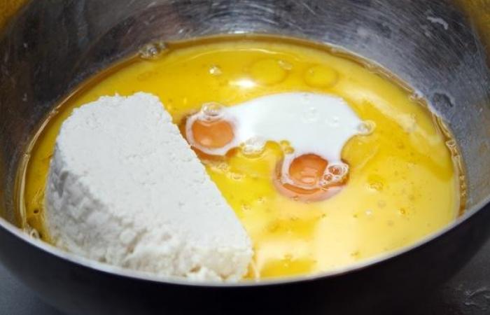 1Смешиваем в емкости молоко, яйца, творог и масло.