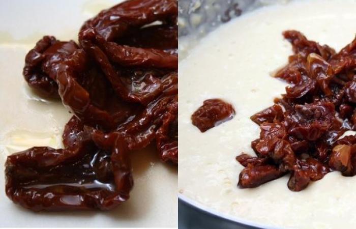 4Вяленые помидоры нарезаем небольшими кусочками и добавляем к тесту.